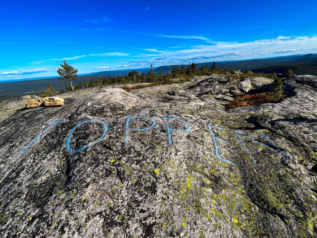 Vi satser på at den bratte ikke er problematisk for hverken to- eller firbente, og for vår del går det greit. Men vil man helst unngå litt klyving, ta den slake stien, som går i en sving rundt toppen og opp. Blåmaling var det visst nok av under merkingen, for snart dukker tre nye meldinger opp. Og de forteller oss at vi snart er…