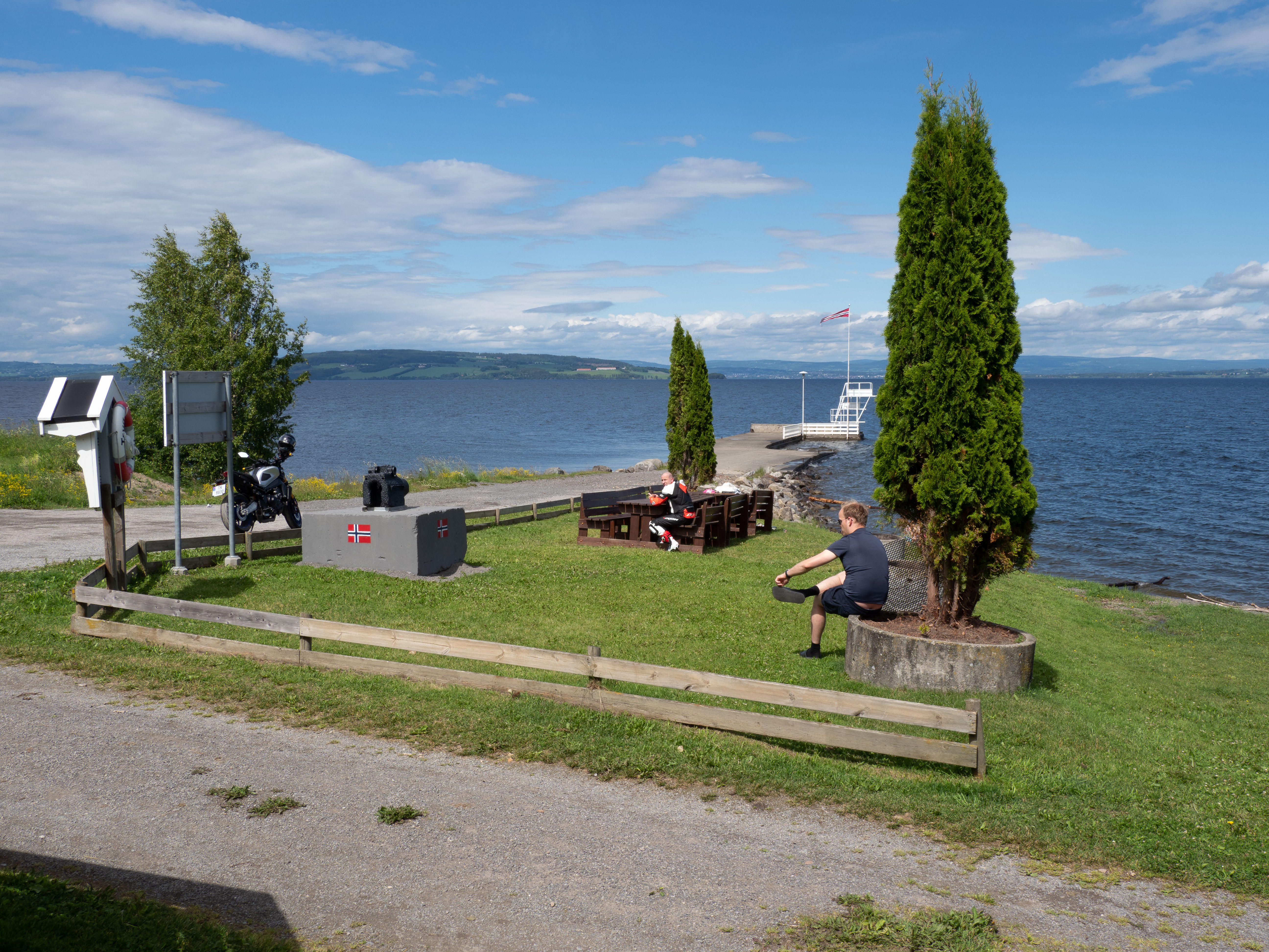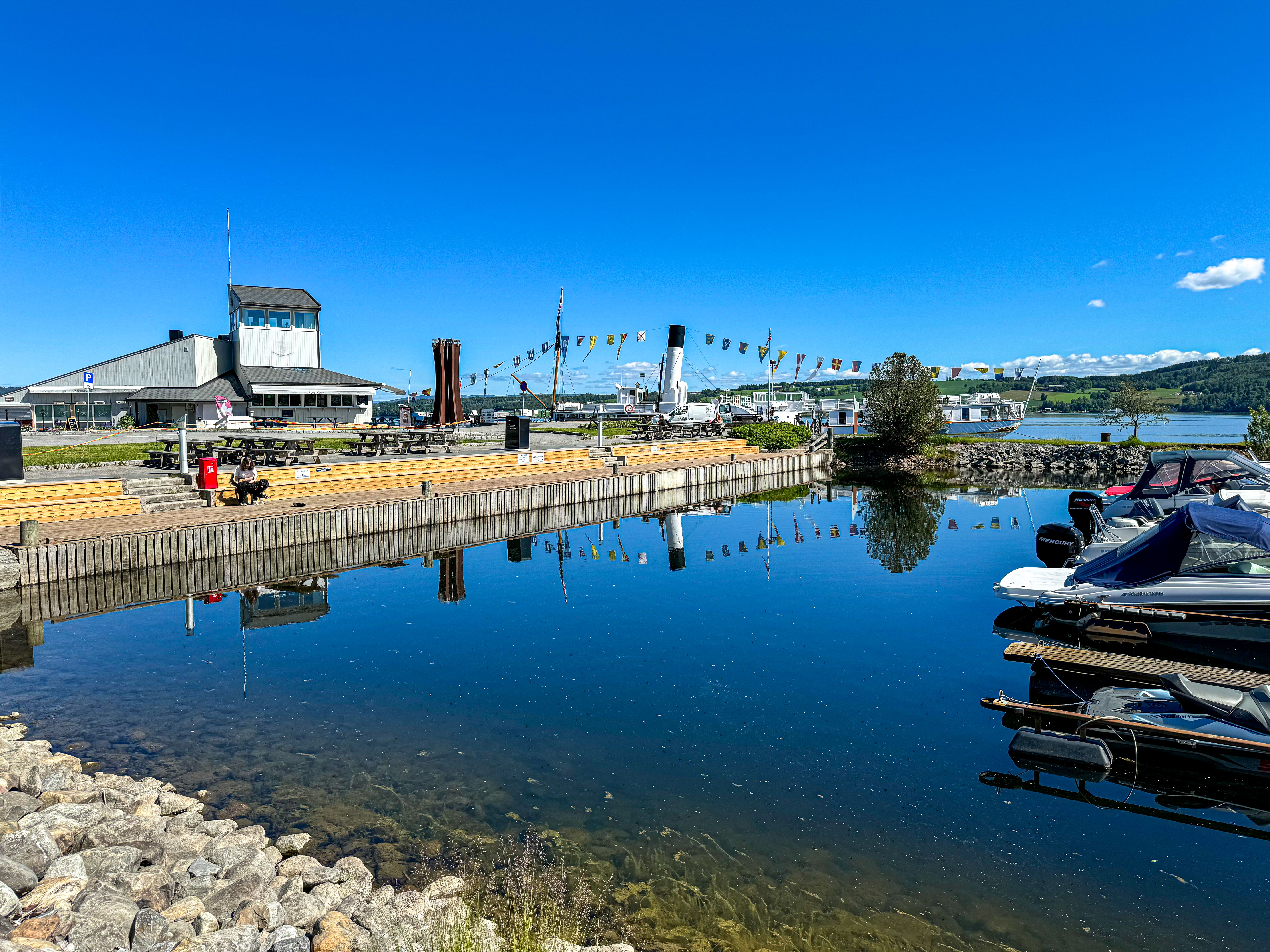Etter oppholdet på Lillehammer kjører vi sørover og over den 1420 meter lange kassebroa Mjøsbrua – Norges femte lengste bro, åpnet i november 1985. Før det måtte man velge mellom ferge Mengshol-Gjøvik eller kjøre en svingete strekning mellom Moelv og Lillehammer. En ny bro er forresten under utredning. Neste mål er et sted vi aldri har besøkt før: Helgøya. Norges største innsjø har også Norges største ferskvannsøy, forbundet til Nes på fastlandet via Nessundet bru. Det første vi ser er…folkeliv! For umiddelbart etter brua ligger Sund båthavn, med sommerkroa kalt Øya Maritim. En tilstøtende stor p-plass gjør det enkelt å parkere selv store bobiler. Snart rusler vi ned for å titte på livet og kjøpe en is.