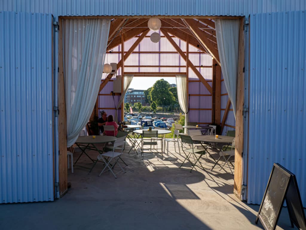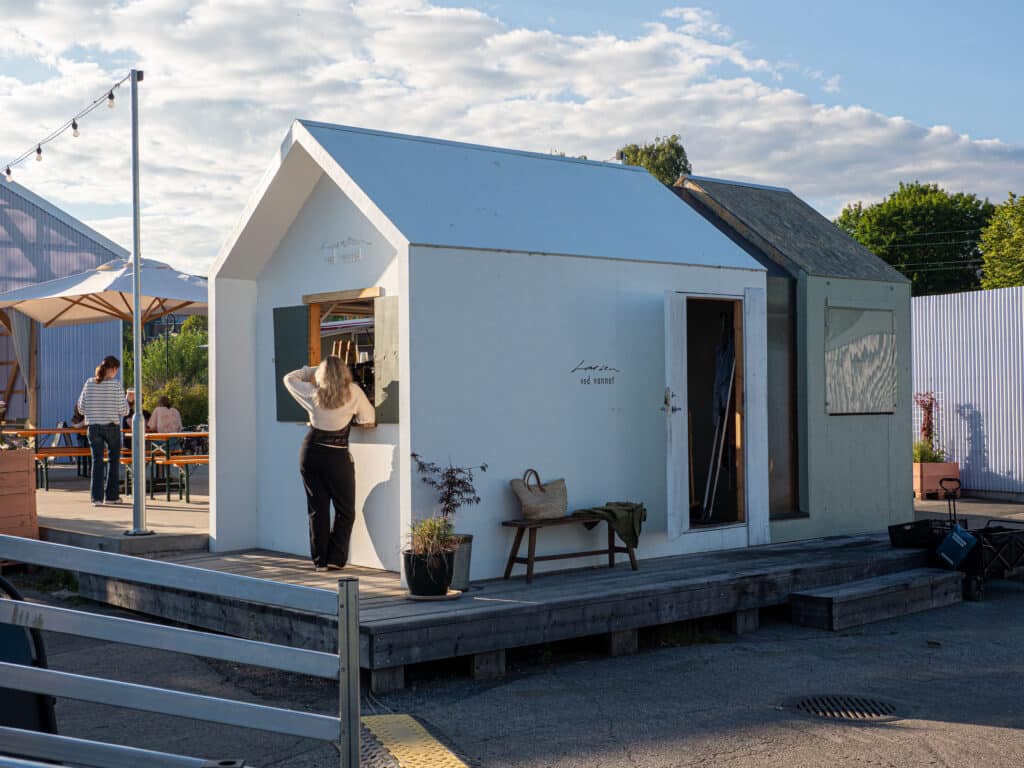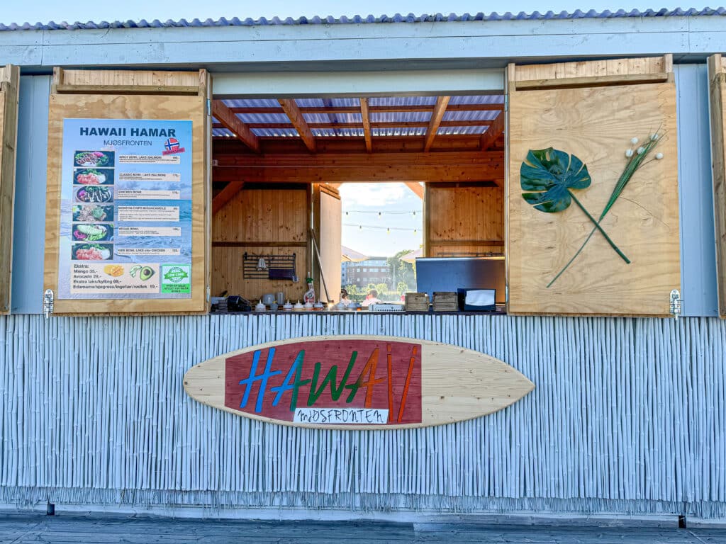 Vi rusler opp til Hamar sentrum og gågata vi var i sist vi besøkte byen. Dessverre har alle butikker stengt 17.00. Så når vi kommer en halvtime senere er gata tom og halvdød. Litt rart når man har hovedstaden som personlig referanse. Kjøpesentrene blir redningen. Og snart skal vi finne ut hvor «alle» er. For på Mjøsfronten – Hamars miniversjon av Aker brygge – er det full rulle. Området helt nede ved Mjøsa er tilrettelagt både for aktiviteter og avslapning. Og selvsagt for den som vil ha mat og drikke, fra enkle men raffinerte spisesteder som tilbyr diverse retter. Mjøsfronten har også egen «sandstrand» med solstoler, parasoller, benker og bord.