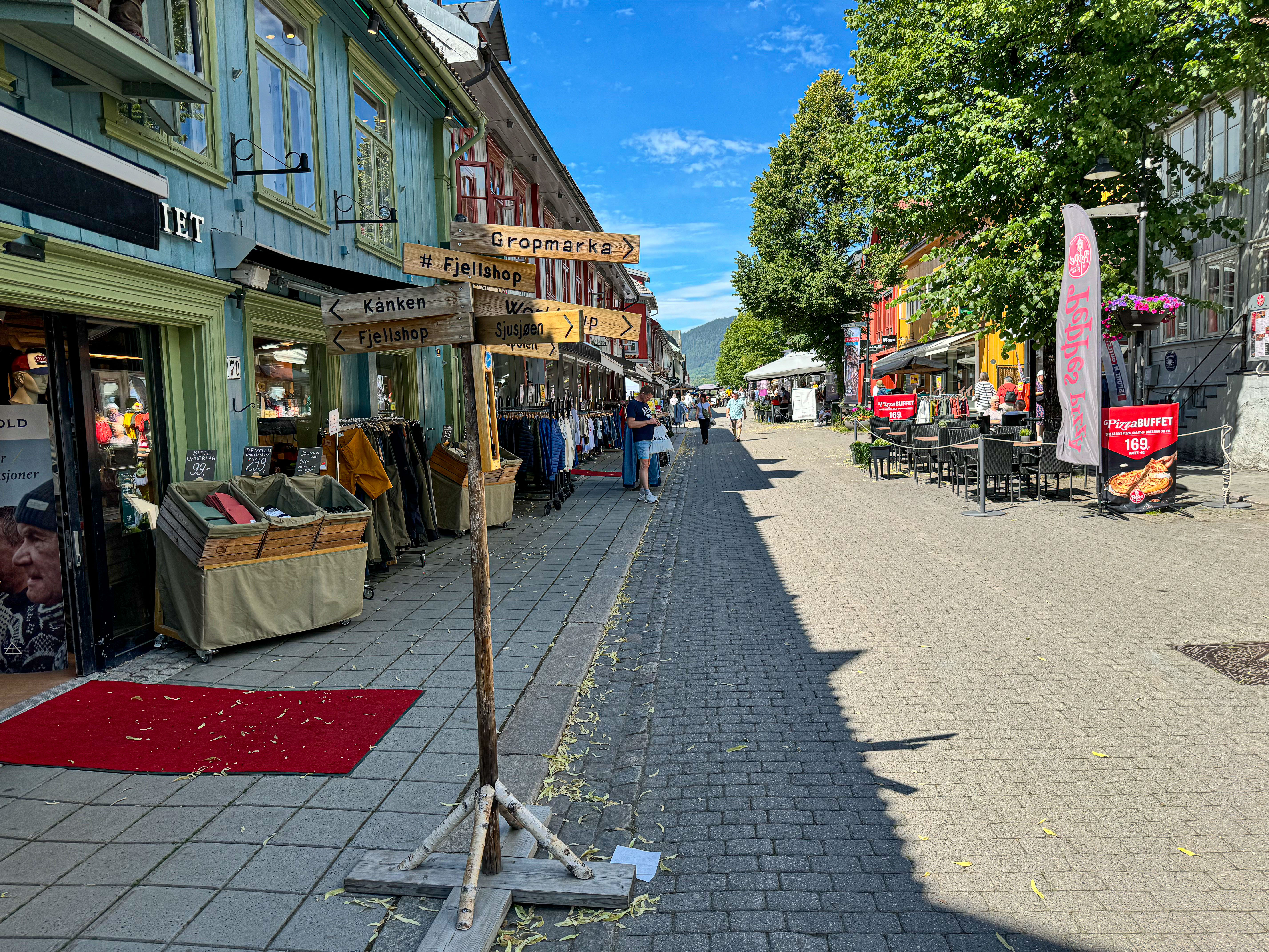 Vi skal ikke begi oss inn på drøftinger om hvem av Mjøs-byene som er mest turistvennlig, men bare fastslå at vi opplever Lillehammers gågate – offisielt kalt Storgata – å være i en egen klasse hva gågater rundt Mjøsa angår. Den er lang så det holder, og preges hele veien av uterestauranter, kafeer, butikker og et myldrende liv. Vi parkerer bybobilen lovlig og enkelt ved Lillehammer kirke (som har egen parkering for den som skal besøke selve kirken), og rusler opp til gågata på en ti minutters tid. Starter i den ene enden, og nyter god service og nydelige burgere i den andre enden, på Heim gastopub.