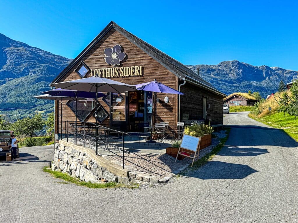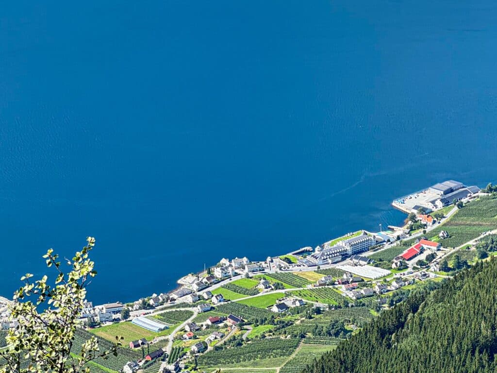 Skogen tykner til etter hvert som vi kommer lavere i terrenget. Vi kommer ned til grusveien som – på samme måte som på Kinsarvik-siden – sikksakker seg nedover. Innimellom er det laget snarveier i form av stier, som vi stort sett gladelig benytter. Plutselig dukker en fryseboks med kald eplemost opp. Velsignet være kremmeren som står bak det kreative påfunnet! Vi tar hver vår, og betaler med Vipps. Så er vi nede ved p-plassen og frukttrærne, og stanser en stund for å kjøpe cider på Lofthus Cideri. Derfra er det bare en kort rusletur bort til campingplassen.
