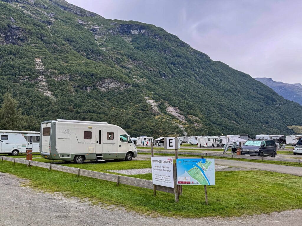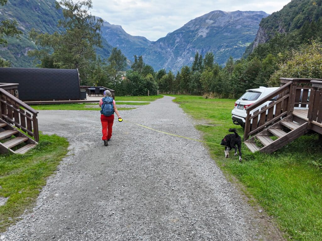 Første del av Fosseråsa-stien starter strengt tatt i Geiranger sentrum, og går opp langs den imponerende Storfossen, på turveier og trappetrinn, trygt bak rekkverk. Da blir distansen litt lenger enn på vår måling. For vi besøker først denne delen av Geiranger, og tar så inn på Vinje Camping ovenfor sentrum. Og starter turen derfra. Et alternativ til denne campingplassen er ellers Geiranger Camping i sentrum. Eller man kan bare parkere et sted, for eksempel ved Norsk Fjordsenter/Besøkssenter verdsarv. Ja, for vi beveger oss i verdensarvområdet Vestnorsk fjordlandskap.