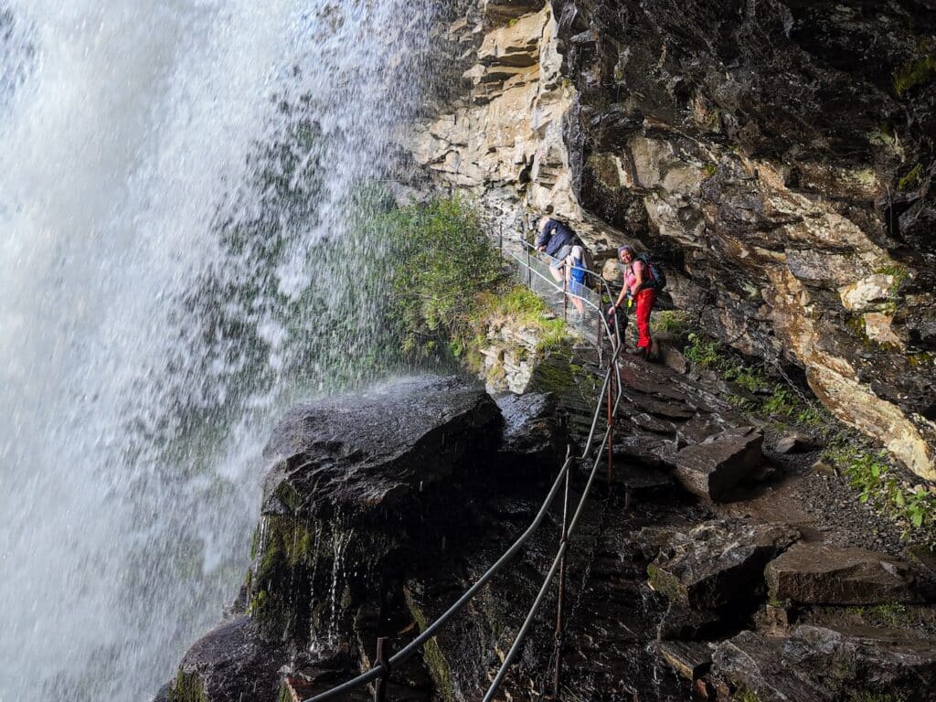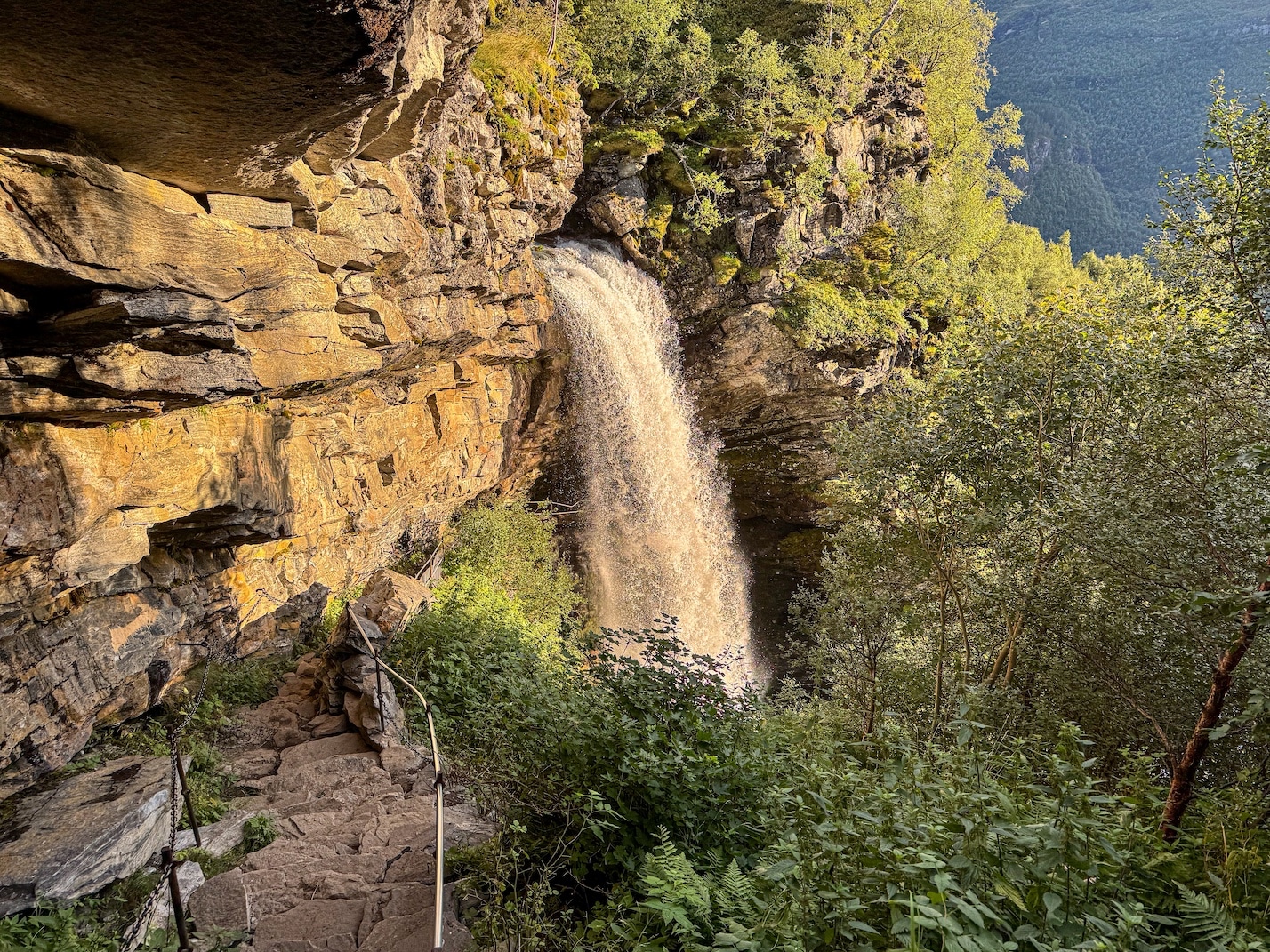 Først ser vi oss litt om på et slags «forværelse» til selve turen ned til og bak fossen. Alva følger litt motvillig med, og er urolig når vi beveger oss inn mot, og til slutt bak, en buldrende foss. For oss tobente er det derimot en fantastisk opplevelse! Som best lar seg beskrive ved hjelp av bilder.