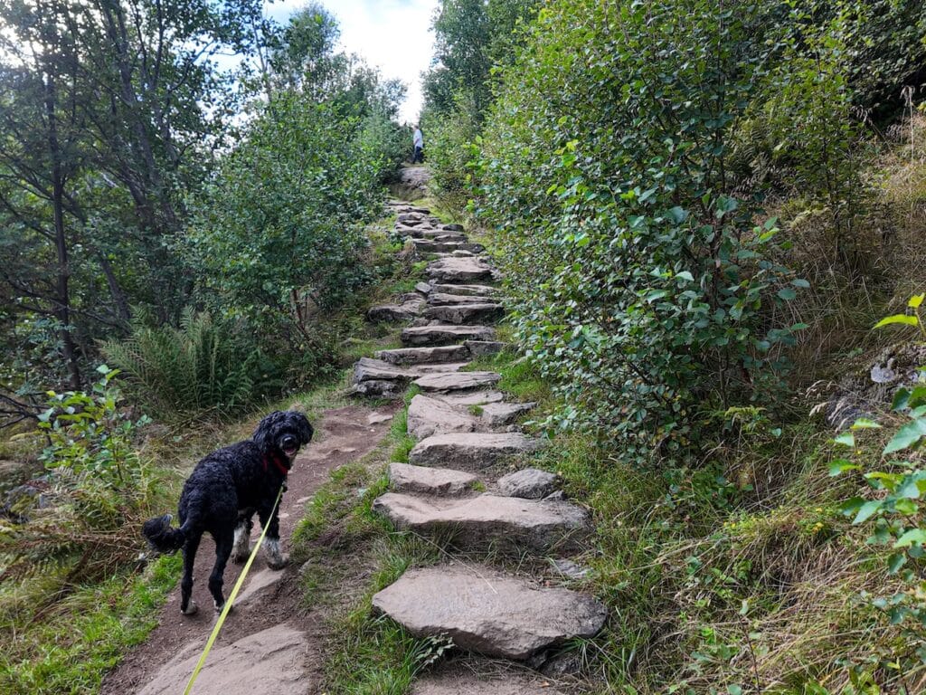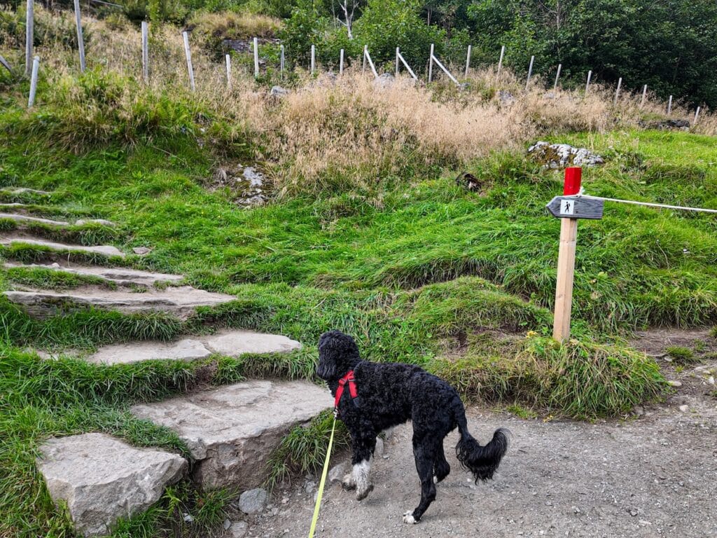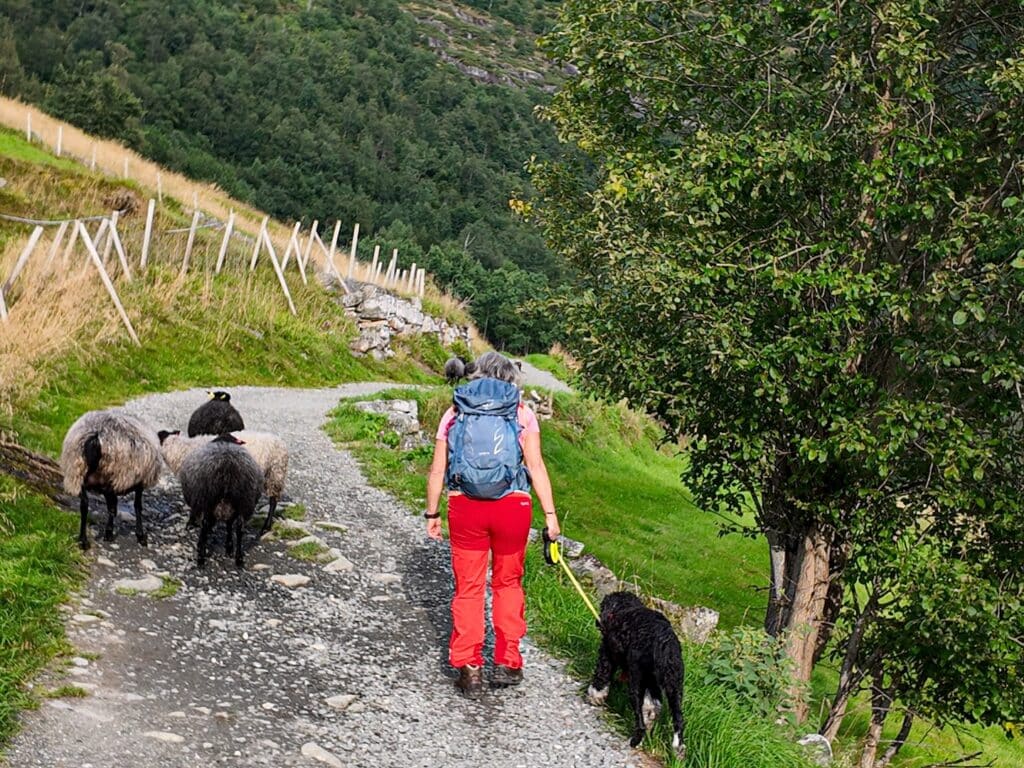 Noen av sauene slår følge et stykke. Muligens tror de at Alva er en slektning. Grusveien går over i sti og flere steintrapper. Etter hvert får vi øye på Storsæterfossen. Og etter nye førti minutter er vi fremme ved fossen vi har gledet oss til å oppleve.